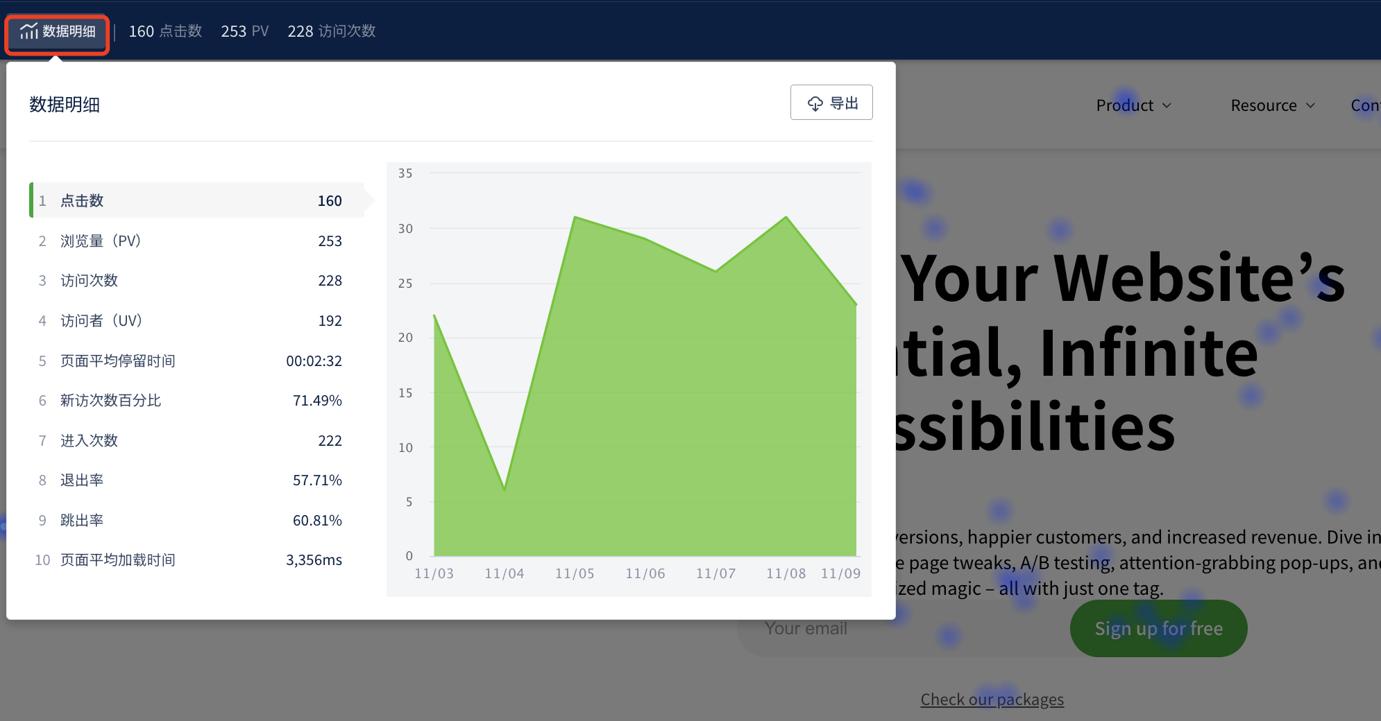 数据报告顶部可以查看不同对比热图的页面基础指标的对比,对不同条件下的页面流量进行概览。